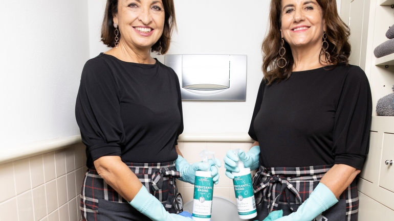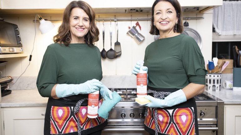 Titty D'Attoma e Flavia Alfano, mostrano i cinque detergenti per la casa della loro linea Titty&Flavia Cleaning . «Sono realizzati con prodotti ed estratti naturali 100…