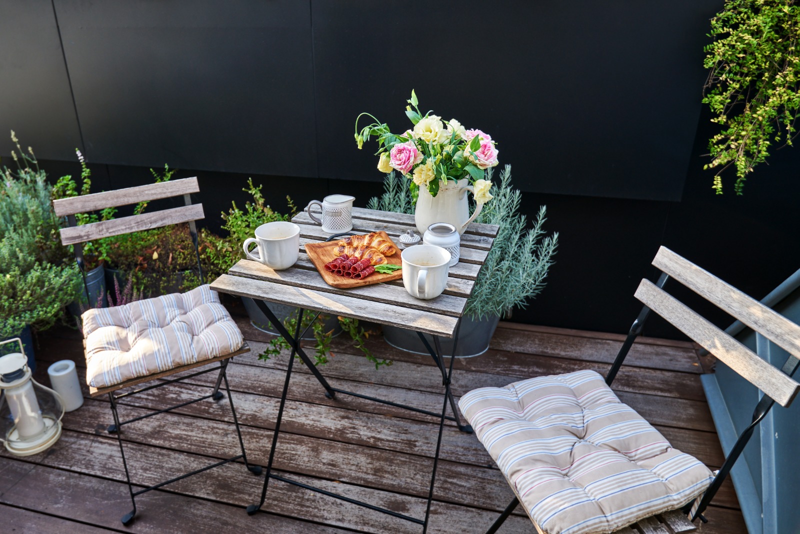 Per giardini piccoli, o angoli ristretti, sono certamente da preferire sedie e tavolini pieghevoli: occupano molto meno spazio, ma con l’aggiunta di qualche cuscino sono comunque molto confortevoli.