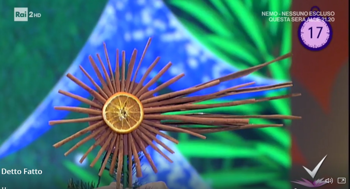 Emanuele, con la collaborazione di Flavia, preparerà un albero con un tema ben preciso: il profumo! Il suo sarà un albero aromatico, in cui oltre alla bellezza dei decori spiccherà anche l’intenso profumo di spezie e agrumi. Per realizzarlo usa fette di arancia e mela essiccate, chiodi di garofano e stecche di cannella. Per creare queste decorazioni basta tagliare delle fette di arancia, o mela, e metterle ad essiccare sopra della carta casa e poi appoggiate sui termosifoni, oppure in forno a 80°. Per incrementarne l’aroma aggiunge alle fette di frutta ormai essiccata dei chiodi di garofano. Con la cannella invece crea delle decorazioni a ghirlanda in questo modo: se sulla cannella ci sono fori passanti infila le stecche in un unico filo lungo, se invece le stecche sono piene crea dei ciondoli con l’aiuto dei chiodi di garofano e fil di ferro.