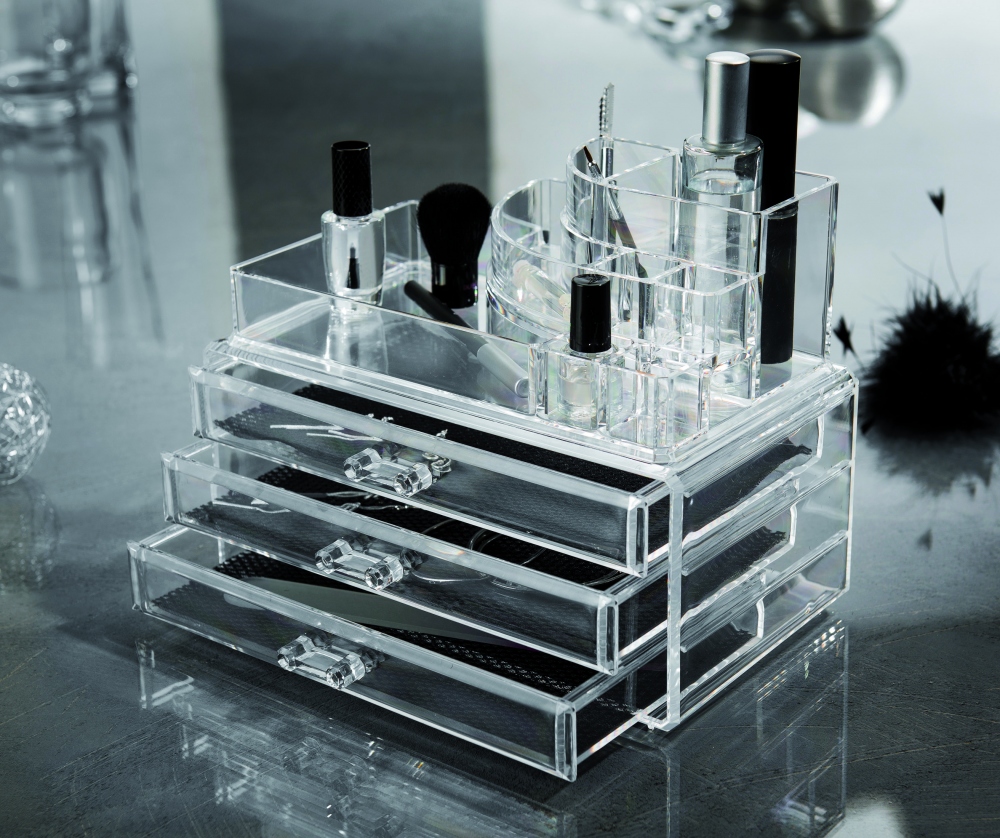 Sappiamo che per lei lo stile è tutto e sappiamo anche che è piena di gioielli e cosmetici che non sa più dove metterli. così le abbiamo regalato Cosmetic, un organizer per gioielli e cosmetici in polistirene trasparente, molto funzionale ma anche bellissimo. Ha 3 cassetti e diversi vani portaoggetti nella parte superiore. I cassetti hanno il fondo rivestito in tessuto per la massima cura dei gioielli, e il vassoio a scomparti della parte superiore può ospitare comodamente i pennelli da trucco, rossetti e smalti.