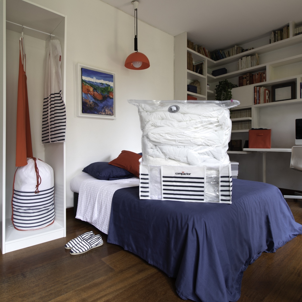 In questo caso la collezione Marinière di Compactor è l’ideale. In primo luogo per la sua finitura in stile marinaro davvero elegante e poi per i suoi pratici formati salvaspazio. La scelta questa volta è andata alla Custodia sottoletto Marinière Blu. la sua altezza di appena 15 cm la rende adatta ad essere riposta anche in spazi molto bassi, ma il sacco interno sottovuoto consente di riporre una gran quantità di vestiti o biancheria da letto: pensate, può contenere l’equivalente di un piumino per 2 persone!