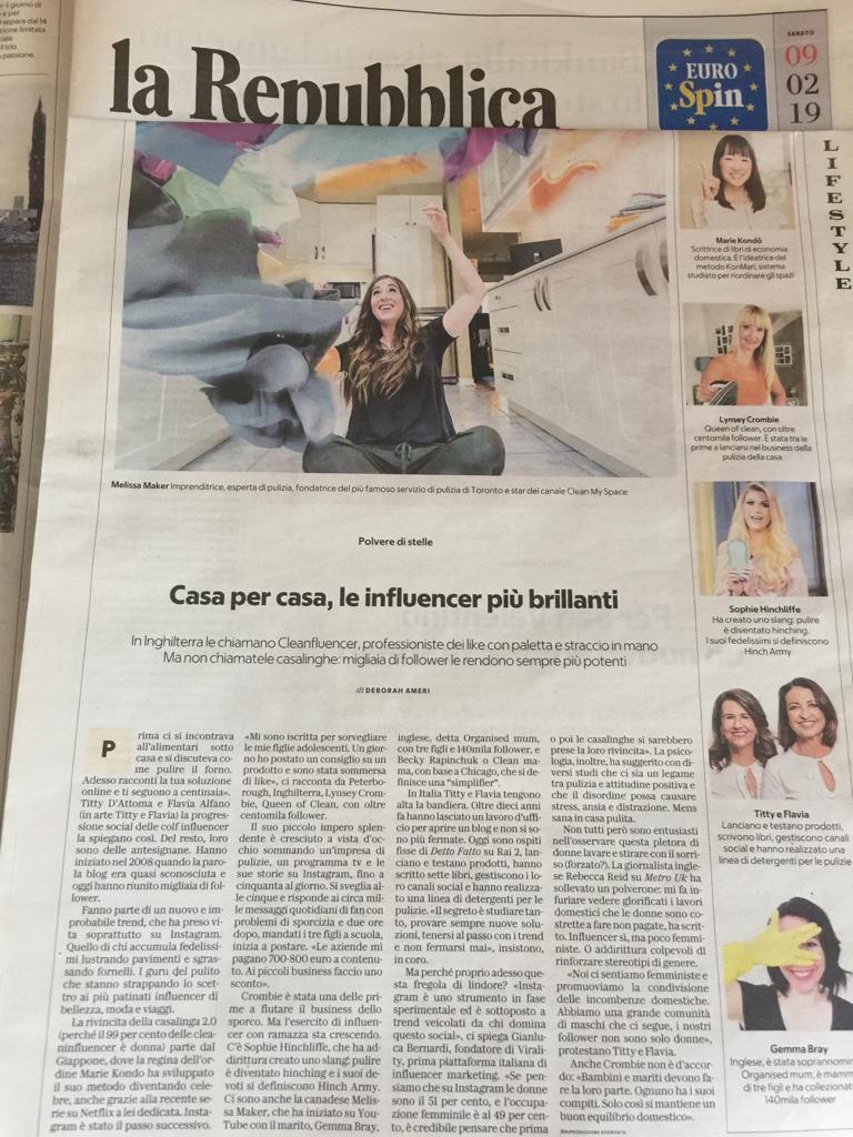 Press Titty & Flavia su La Repubblica Press Casa per casa, le influencer più brillanti! In Inghilterra le chiamano Cleaninfluencer, professioniste dei like con paletta e straccio in mano. Ma non chiamatele casalinghe: migliaia di follower le rendono sempre più potenti.